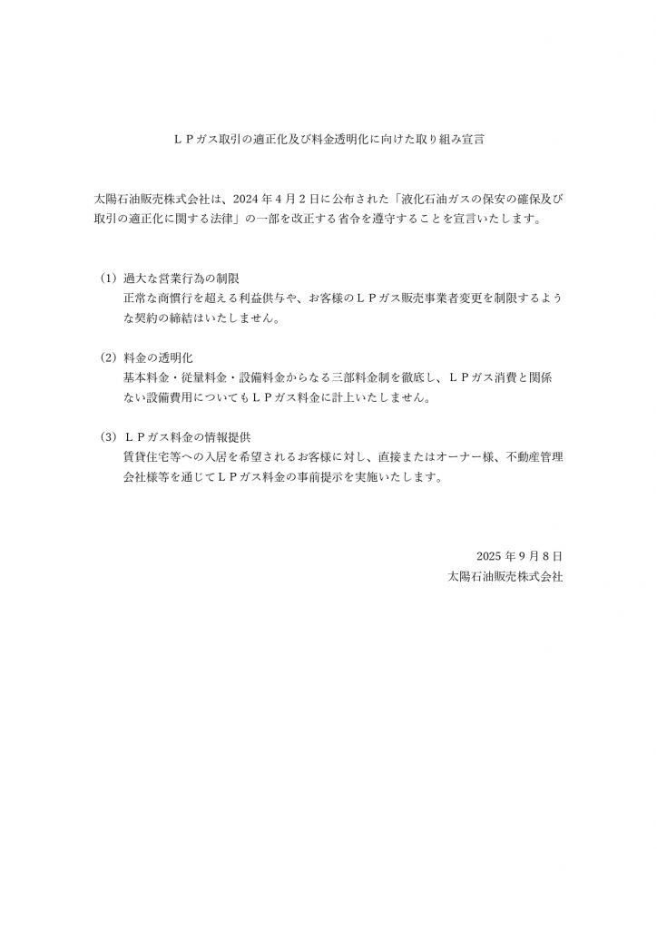 LPガス取引の適正化および料金透明化に取り組むことを宣言いたします。